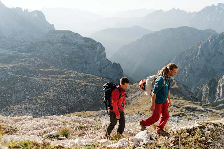 Der Wanderklassiker im Naturpark Drei Zinnen: Die Umrundung des weltberühmten Wahrzeichens der Dolomiten startet an der Auronzohütte (2.320 m), führt über den Paternsattel (2.454 m) zum Rienzursprung, direkt zur Langalm (2.235 m) und zurück zur Auronzohütte. Eines von vielen landschaftlichen Highlights sind die drei Zinnenseen, in denen sich die Nordwände der Drei Zinnen spiegeln.