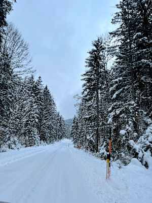 Unser erster Eindruck an unserem Winter-Hüttenwochen-Ziel, der Alpenwelt Karwendel: Das ist in Wahrheit Kanada. Anders kann man die Szenerie beim vorsichtigen Rollen über die schneebedeckte Mautstraße von Vorderriß nach Wallgau (unbedingt mit Winterreifen!) nicht beschreiben. Rund um den Sylvenstein-Stausee und entlang der eisigen Isar biegen sich die Äste des dichten Nadelwalds unter frischgefallenen Schneepolstern, die umliegenden Hänge des schmalen Tals sind bis zu den Gipfeln angezuckert. Und tatsächlich verläuft etwas unterhalb der Mautstraße, direkt neben dem Fluss, die sogenannte „Kanadaloipe“ wie uns Thomas Pfund von der Skischule Krün-Wallgau heute Vormittag aufklärt.