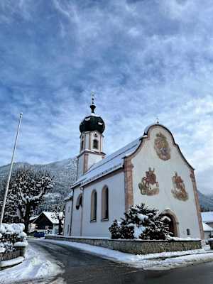 Lüftlmalerei ist im Karwendel allgegenwärtig – die bunte Verzierung der Hausfassaden zeigt mal religiöse, mal sehr alltägliche Motive, hübsch ist sie allemnal. Die Maibäume ragen hier auch noch im Januar in den winterlichen Himmel. Und am Sonntag wird Schweinskrustenbraten gegessen.