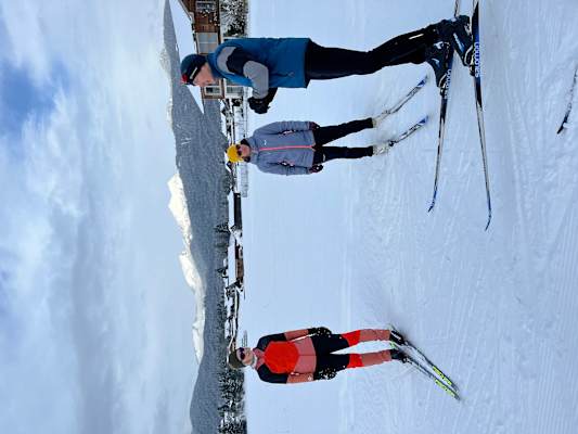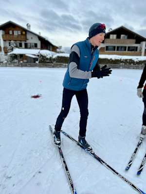 Für manche von uns kam das überraschend, doch bevor wir überhaupt zum ersten Mal die Langlaufstöcke in die Hand nehmen, lässt uns Thomas eine Reihe von Übungen ohne diesen wesentlichen Bestandteil der Langlaufausrüstung absolvieren. Das bewirkt zwar, dass wir zunächst öfter am Hintern landen als grazil durch den Schnee gleiten, doch dadurch wird das Balancegefühl gefördert.