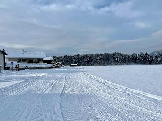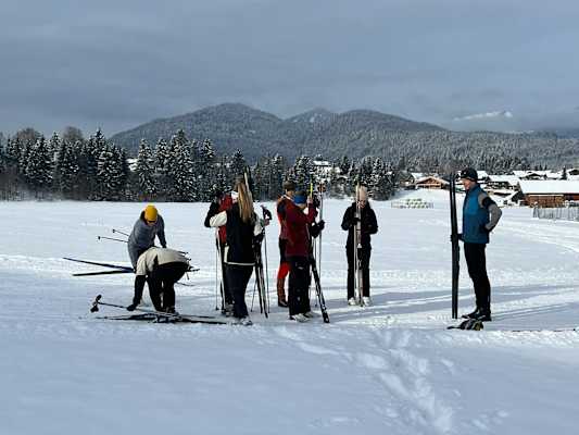 Besagte Kanadaloipe – übrigens nur eine von fünfzehn im Langlauf-Paradies Alpenwelt Karwendel, das unter anderem die aus Wallgau stammende Biathlon-Olympiasiegerin Magdalena Neuner hervorgebracht hat – ist für uns noch eine Spur zu anspruchsvoll. Wir wollen nämlich Skating erlernen, das durch seine ans Schlittschuhlaufen erinnernde Bewegung gegenüber dem klassischen Stil technisch schwieriger ausfällt. Für die meisten von uns ein erster Versuch – für den laut Thomas die kleine „Friedhofsrunde“ (nein, sie ist nicht so halsbrecherisch wie ihr Name vermuten lässt) auf einer weiten Fläche hinterm Waldfriedhof Krün völlig ausreicht. Landschaftlich steht sie in die umliegende Bergwelt gebettet den längeren Routen um nichts nach.