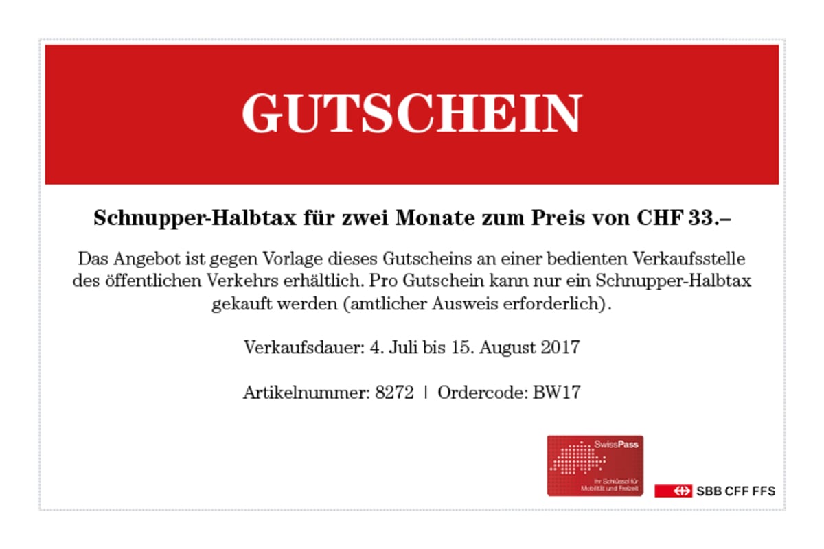 Vom 4. Juli bis 15. August 2017 ist das Schnupper-Halbtax für zwei Monate zum Preis von CHF 33.–* erhältlich!