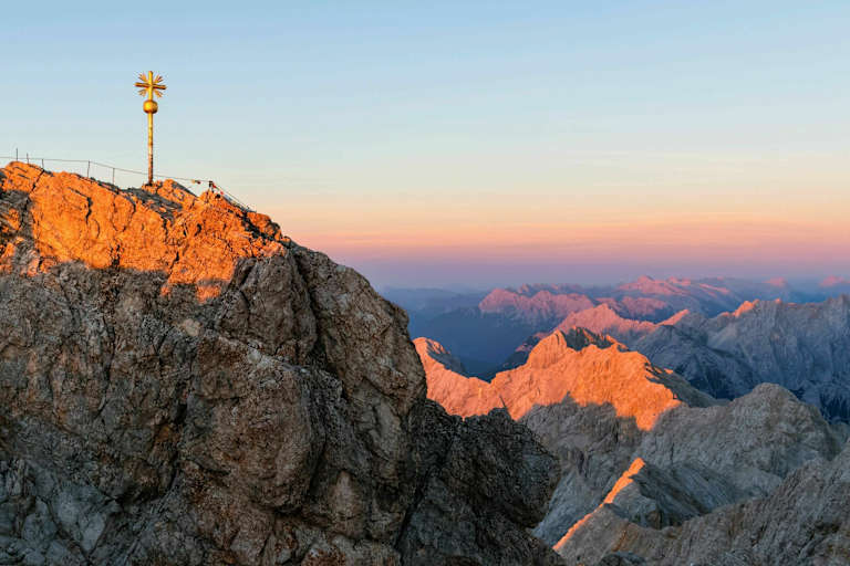 Die Zugspitze (2.962 m) ist der höchste Gipfel Deutschlands und liegt an der Grenze zu Österreich. Sie ist Teil des Zugspitzmassivs, das sich über eine Fläche von etwa zehn Quadratkilometern erstreckt. An klaren Tagen reicht der Blick vom Gipfel bis zu den weit entfernten Dolomiten im Süden.