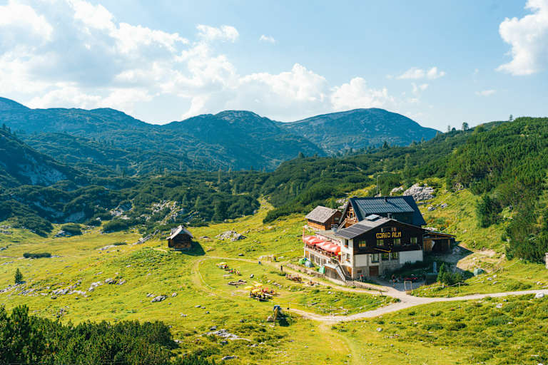 Die Gjaid Alm (1.738 m) liegt wunderschön auf der Hochfläche des Dachsteinplateaus und somit mitten im UNESCO-Welterbegebiet Hallstatt-Dachstein. Kein Wunder, dass sie sowohl im Sommer wie im Winter gerne aufgesucht wird – nicht zuletzt dank der kulinarischen Köstlichkeiten, die hier traditionell kredenzt werden.