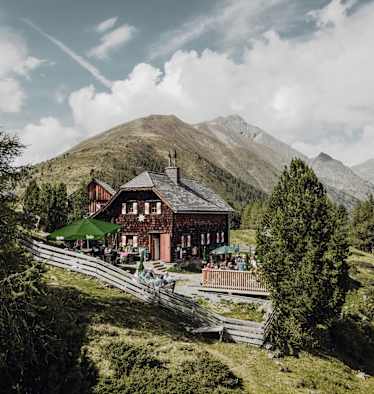 Die Sonnenterrasse der Grazer Hütte macht an diesem Tag ihrem Name alle Ehre und dementsprechend groß ist der Andrang. Hüttenwirt Christian Dengg kommt kaum zum reden, weil er ständig mit leeren Händen in die Küche rennt und mit vollbeladenen Pfannen und Tellern zurückkommt. „Macht nichts“, sagt er, „ich wollte immer schon eine Hütte haben. Den Stress nehm ich gar nicht als solchen wahr.“