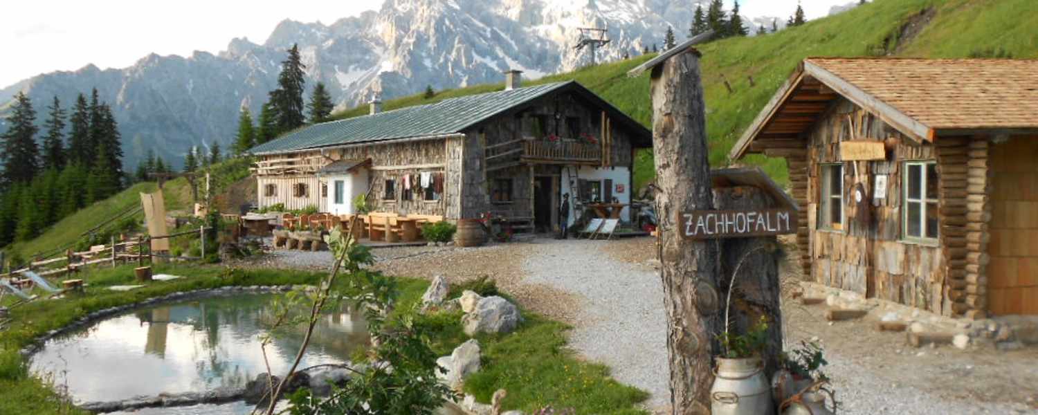 Die urige Zachhofalm liegt oberhalb von Dienten mit direktem Blick auf das Hochkönigmassiv. Vom Parkplatz der Talstation zweier Sessellifte wandert man entweder auf dem Forstweg oder auf dem Wald- und Wiesenweg Nr. 64 zur Alm. Heidi und Isabella bewirtschaften diese mit viel Leidenschaft und verköstigen ihre Gäste mit herzhaften Schmankerln, deren Zutaten im eigenen Kräutergarten gedeihen bzw. der Bio-Landwirtschaft des Famillienbauernhofes entstammen. Auch ein lichtdurchfluteter Seminarraum, Kräuterworkshops und Übernachtungsmöglichkeiten stehen hier oben zur Verfügung.