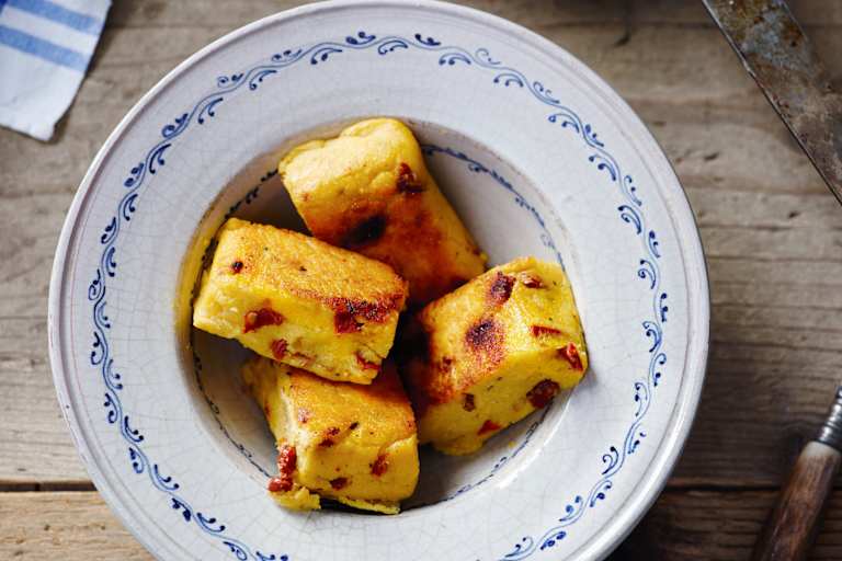Ob mit gehackten Olivenstücken, Frühlingszwiebeln, Knoblauch oder getrockneten Tomaten: Gebratene Polentaschnitten schmecken warm zu Salat, als Einlage in einer dampfenden Suppe oder als Proviant für Skitouren und Bergwanderungen.