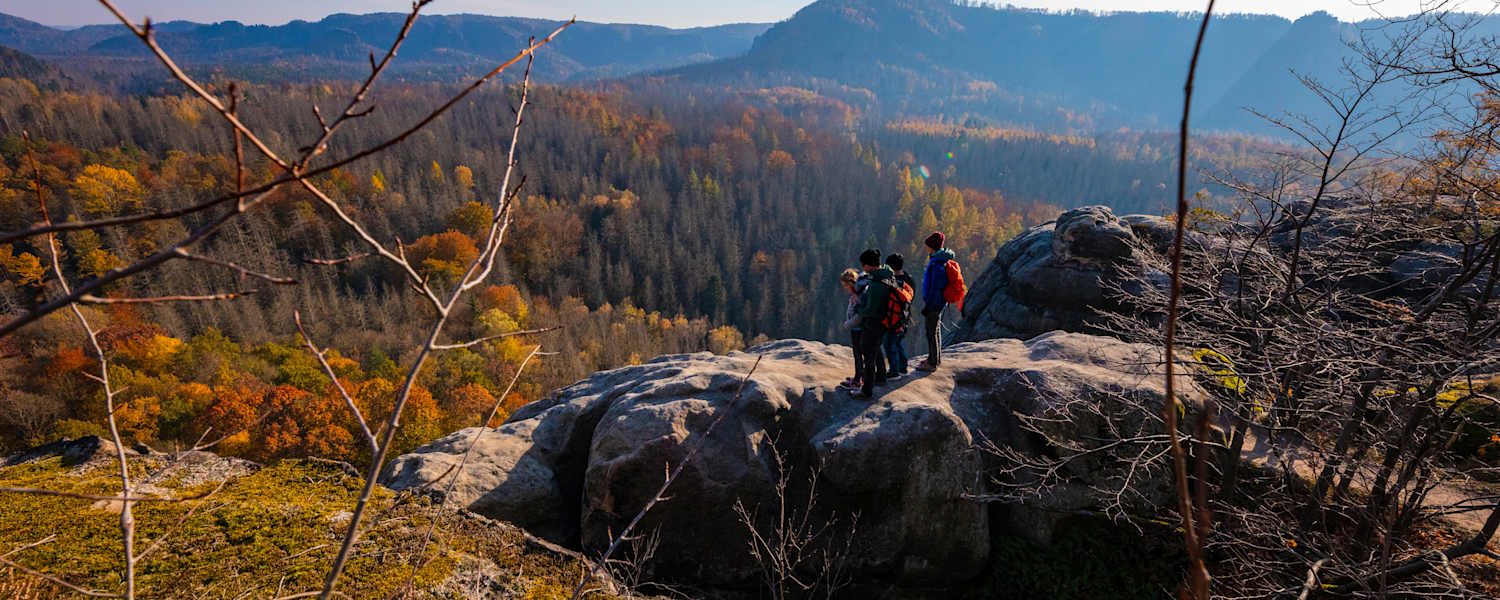 Die Sächsische Schweiz ist ein familienfreundliches Wanderparadies. Der kleine Rundweg führt zur Schrammsteinaussicht und Hohen Liebe, von wo man über die Sächsische Schweiz und auf die Felsformation der Schrammsteine blickt. Während der Tour ist ein Steig, der sich mehrere Eisenleitern und Treppen hinaufzieht, zu bewältigen. Die Wanderung ist daher eher für etwas ältere, trittsichere Kinder geeignet.