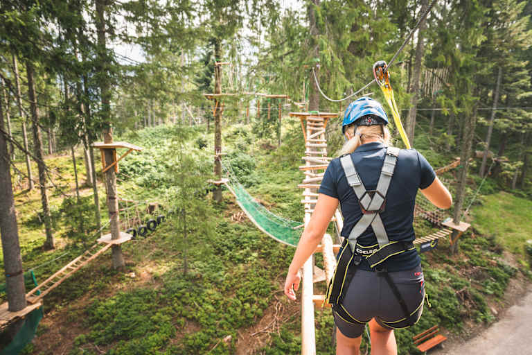 Mut und Schwindelfreiheit sind relativ praktische Eigenschaften, wenn man den Waldseilgarten Natrun bewältigen möchte. Gut ausgerüstet und gesichert durchquert man den Parcours in luftiger Höhe – ein echtes Erlebnis! Kinder bis 15 dürfen den Waldseilgarten nur in Begleitung eines Erwachsenen betreten. Der Name lässt bereits erahnen, dass der Kletterprinzessin-Parcours von dieser Regel ausgenommen ist.