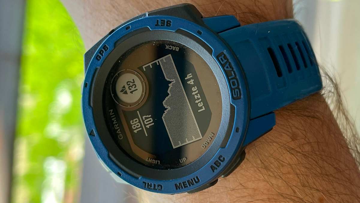 Weil die Höhenangabe unserer Uhr vom Luftdruck abhängig ist, kann es zur falschen Anzeige der Höhenlage kommen – sofern der Höhenmesser nicht regelmäßig geeicht, also nachjustiert wird. Zumindest am Ausgangspunkt muss die aktuelle Höhe am Höhenmesser somit richtig eingestellt werden. Diese lässt sich zumeist leicht aus einer Karte oder Ausschilderungen vor Ort herauslesen.
