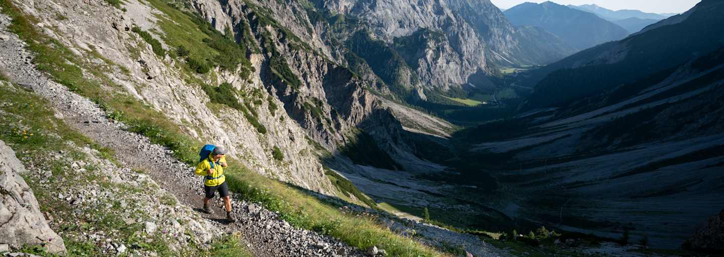 Etappe 2 der Karwendel-Durchquerung führt aus Bayern nach Tirol: Von der Hochlandhütte folgt man zunächst einem stetig ansteigenden Pfad durch Latschen, ehe man auf dem (anfangs drahtseilversicherten) Gjaidsteig immer wandnah an den Felsen der Nördlichen Karwendelkette entlang wandert und mit Überschreitung des Bäralplsattels die Grenze von Bayern nach Tirol überschreitet. Hat man das Karwendelhaus (1.765 m) erreicht, präsentiert sich bereits das nächste Etappenziel: die Birkkarspitze (2.749 m). Erst einmal darf man sich aber natürlich erholen und bei Schweinsbraten und Kaiserschmarrn wieder zu Kräften kommen.