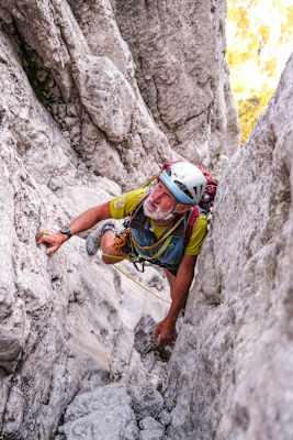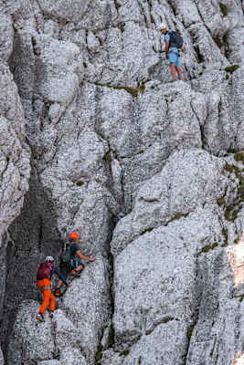 Also hinauf in die Wand, ausgestattet mit Schöffel-Jacken: Wir haben uns für den „Führerweg“ entschieden, den leichtesten Anstieg auf das Totenkirchl. Ein Spaziergang ist das keinesfalls: Ausgesetzte Kletterstellen bis zum dritten Grad, verzwickte Wegfindung, 400 Meter Wandhöhe – angesichts der nackten Fakten könnten einem doch glatt die Luft wegbleiben. Aber auch für diesen Fall haben wir bereits am Vortag vorgesorgt, wir haben ausführlich über das gesprochen, was jede und jeder von uns von der Geburt an erstaunlich kontinuierlich macht: Genau, atmen!