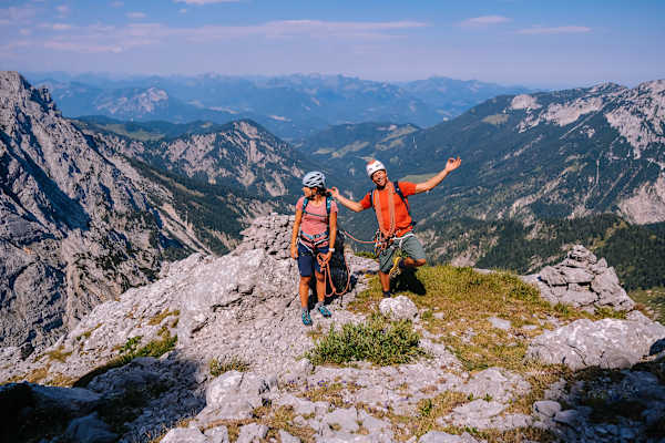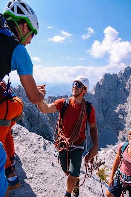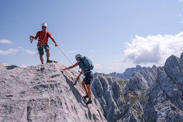 Unsere Sonnengrüße scheinen vorzüglich funktioniert zu haben, so wie gestern scheint auch heute uneingeschränkt die Sonne vom tiefblauen Himmel. Zurück zum Jetzt, noch zwei Seillängen bis zum Gipfel des Totenkirchl, auf dem exponierten Platz in 2.190 Metern Höhe sind wir schlussendlich voller Freude über das Geschaffte. Doch gleichzeitig ist uns nun auch klar, dass es hier nicht um Leistung geht, sondern um Akzeptanz und Dankbarkeit.
