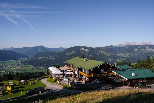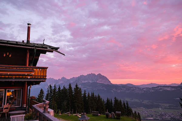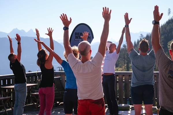 Yogi Manfred Jericha leitet uns durch eine sanfte Pranayama-Einheit, während Gerlinde Kaltenbrunner, Extrem-Bergsteigerin, Yogalehrerin und dessen Lebenspartnerin, behutsam Korrekturen bei den Übenden durchführt. Idyllischer als auf der Terrasse der Angerer Alm am Kitzbüheler Horn in der Region St. Johann in Tirol könnte ein Sonnenaufgangs-Setting nicht sein: Sanftblaue Berg-Silhouetten bieten den optischen Rahmen, während Kuhglocken für den Hintergrund-Sound sorgen und die Morgensonne vom Himmel strahlt.