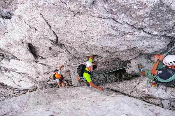 Und dieses „immer“ beinhaltet eben auch ein Bergansteigen im vertikalen Gelände, so wie wir nun, mitten im kaiserlichen Traumkalk des Totenkirchl. Zugegeben, zwischen dem ganzen Ziehen, Höhersteigen, Ausspreizen manchmal gar nicht so einfach. Aber wie alles im Leben ist dies eben auch eine Übungssache. Das lässt sich im Alltag erlernen und im Sport weiter perfektionieren. Unser Tiefblick wird eindrücklicher, je höher wir kommen. Tief durchschnaufen – aber eben durch die Nase.