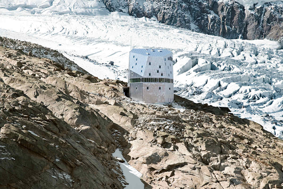Wenn man aus der Ferne auf die Hütte blickt, verschwindet sie in der gewaltigen Kulisse des Monte-Rosa-Massivs. In der Nahansicht würde man aber bemerken, dass sie nicht auf einem Sockel, sondern eigentlich auf Pfählen steht. Wenn der Untergrund durch Permafrostschmelze instabil zu werden droht, kann man Hütten nicht mehr wie gewohnt bauen. Damit das beheizte Volumen nicht zur Schmelze beiträgt, haben wir die Hütte bewusst vom Untergrund abgelöst.