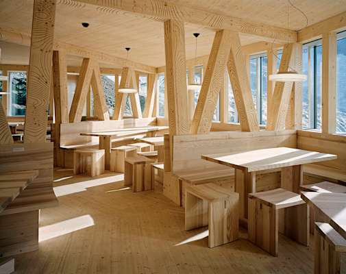 Also, der Hüttenwart hat bis jetzt nur Gutes berichtet. Es kommt ja bei den Hütten auch immer ganz entscheidend auf die Betreiber an. Ich glaube, dass die Frage nach Gemütlichkeit mit Menschen zu tun hat und wie sie zusammen interagieren. Zur Gemütlichkeit trägt aber auch immer Holz bei, aus Gründen, die man noch gar nicht so genau weiß. Auch vor diesem Hintergrund haben wir das Material bewusst eingesetzt, z. B. im Restaurant bis hin zu den Bänken und Tischen. Wir haben sogar mit dem Roboter digitale Schnitzereien in die Tragpfosten gekerbt. Letztlich müssen sich die Leute auch in einem innovativen Bau wohlfühlen und gerne kommen. Das ist der oftmals schwierige Spagat, den man in der Architektur finden muss.