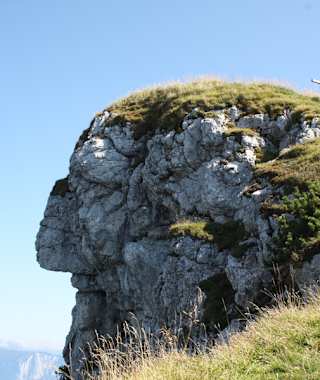 Die wunderschöne Tour auf den Hohen Kalmberg lohnt sich nicht nur wegen der markanten Steinformation kurz unterhalb des Gipfels, die aussieht wie das Profil eines Männergesichts. Beim Aufstieg von Gosau durchquert man zuerst naturbelassene Wälder, die bald einen beeindruckenden Panoramablick vom Traunstein bis zum Tennengebirge freigeben.