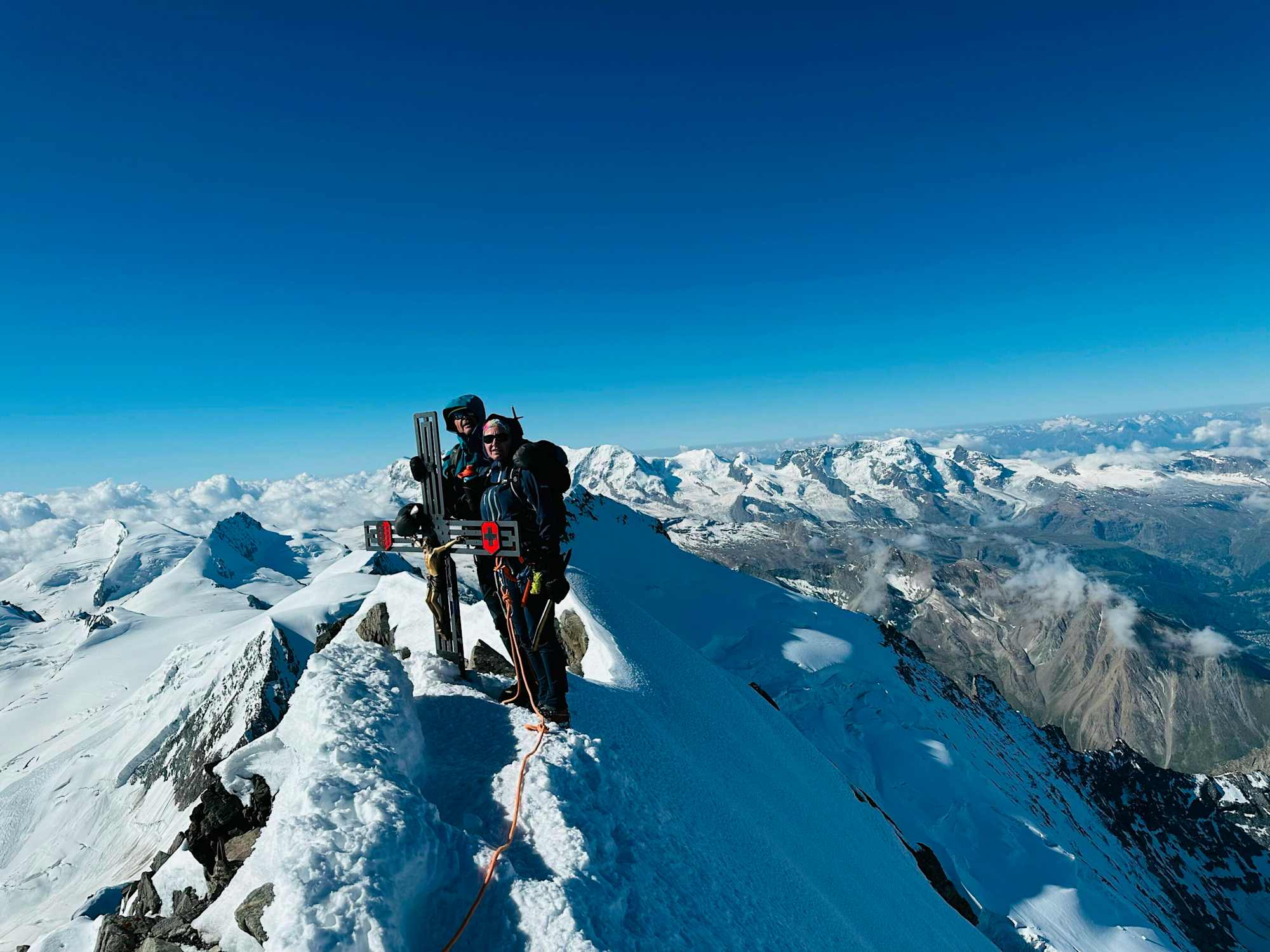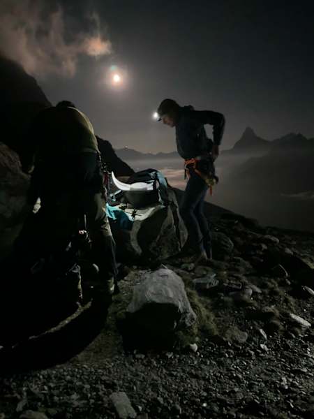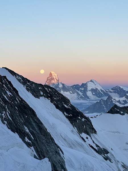 Der Mond stand noch riesig über dem Matterhorn. Es ist immer ein magischer Moment, wenn nach einem langen Marsch im Dunkeln die anderen Gipfel im Umfeld langsam sichtbar werden. Die immer steiler werdende Nordwestflanke unmittelbar vor dem Gipfelkreuz hat mich dann sehr viel Kraft gekostet, weil ich versucht habe, das noch immer schwache Sprunggelenk mit verstärktem Einsatz des anderen Beins zu entlasten. Die letzten Meter waren dann noch einmal extrem steil, bevor es über einen schmalen Grat zum Gipfelkreuz ging. Dass ich nicht aufgegeben hatte, bescherte mir ein unglaubliches Gefühl – und ich war echt stolz auf mich. Die Aussicht war einfach grandios – für mich eine wahre Energie-Ladestation.