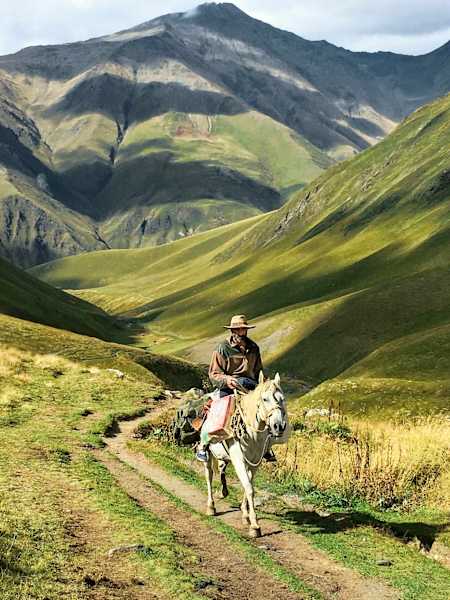 Nach einigen Tagen war die Landschaft allmählich ins Unterbewusstsein gesickert. Auf unseren Wanderungen – zum Kasbek-Gletscher und ins abgelegene Juta-Tal an der Grenze zu Tschetschenien – sind sie uns immer vertrauter geworden: Die wuchtigen Bergrücken und grasgrünen Knitterfalten, als hätten Riesenhände eine Schatzkarte zerknüllt und einfach liegengelassen. Die tiefziehenden Wolken und verstreuten Schatten, wie Balsam für den Geist. Dazwischen ein einsamer Reiter, der auf seinem weißen Gaul einen Trampelpfad entlangritt, ungewiss, woher er kam und wohin er unterwegs war.
