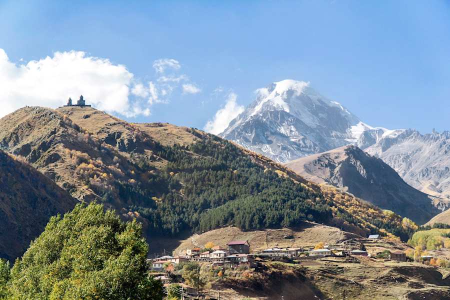 Der Bergort Kazbegi am Fuße des 5.047 m hohen Kasbek und das einsame Juta-Tal