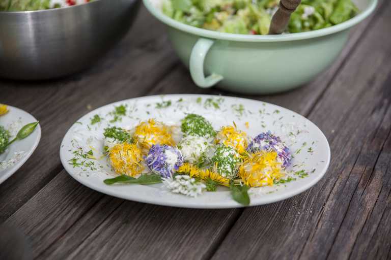 - Mit feuchten Händen kleine Kugeln formen und in den Blüten bzw. den klein geschnittenen Blättern und Kräutern rollen.