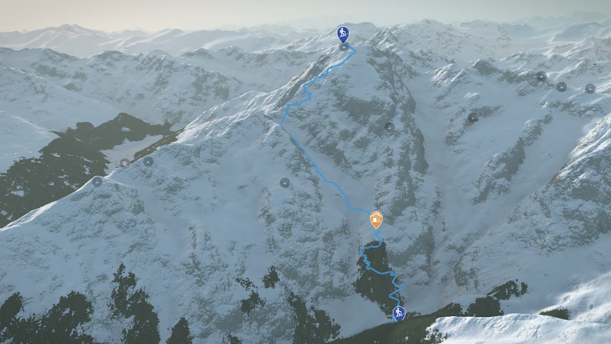 Die Abfahrt verläuft entlang der Aufstiegsroute hinab zur Berglhütte. Bei guten Schneebedingungen ist die Abfahrt sogar bis in die Schlucht des Pleissenbaches und zum Parkplatz in Heilig Drei Brunnen möglich. In schneearmen Wintern folgt der Abstieg eurem Aufstiegsweg vom Vortag.