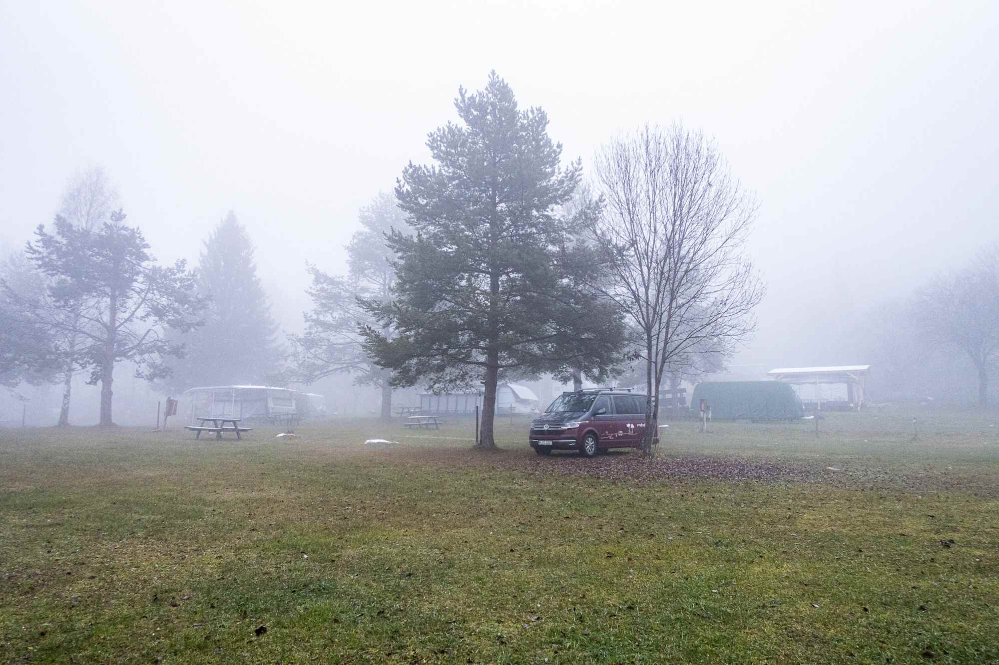 Nach einer einstündigen Fahrt zurück Richtung Osten schlagen wir am Campingplatz Rothenfels, nur 15 Autominuten vom Lachtal entfernt, unser Horrorfilm-reifes Lager auf. Wir sind komplett alleine in der stockdunklen Nacht. Im Schein unserer Stirnlampen schleichen Nebelschwaden um die gruselige Burg, die über uns thront. Es ist totenstill. Heute wird – hoffentlich (!) – nichts und niemand unseren Schlaf stören.