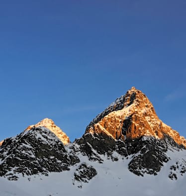 Am nächsten Morgen geht es sehr früh los und die ersten Sonnenstrahlen erwischen uns erst am Weg zum Mittaghorn. Über den Südgrat geht es auf den Gipfel, wo sich die Schlüsselstelle der Tour befindet: Ein kurzer Felsgrat mit einer Abkletterstelle fordert sicheres Gehen mit Steigeisen und Ski am Rucksack sowie Abseil- oder Sicherungsmanöver. Oben angekommen solltet ihr unbedingt eine längere Pause einlegen und euren Blick in aller Ruhe über die umliegende Bergwelt schweifen lassen.
