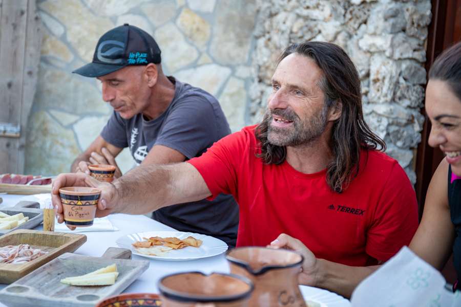 Hier, im kleinen Dorf Baunei, trifft Alex Huber seine sardischen Freunde, um eine gemeinsame Trekkingtour zu planen. Es ist einer der spektakulärsten und anspruchsvollsten Weitwanderwege ganz Italiens: der Selvaggio Blue. Der „wilde Blaue“ führt in fünf Tagesetappen entlang des Golfo di Orosei durch die Wildnis einer Hunderte Meter hohen Steilküste. Diese Küste mit ihren Buchten, Grotten und Macchia-Wäldern ist Weltnaturerbe und nur von alten Hirten- und Köhlerwegen durchzogen. Der Pfad ist mehrmals so ausgesetzt, dass Alex seine Freunde in den felsigen Passagen mit dem Seil sichern muss.