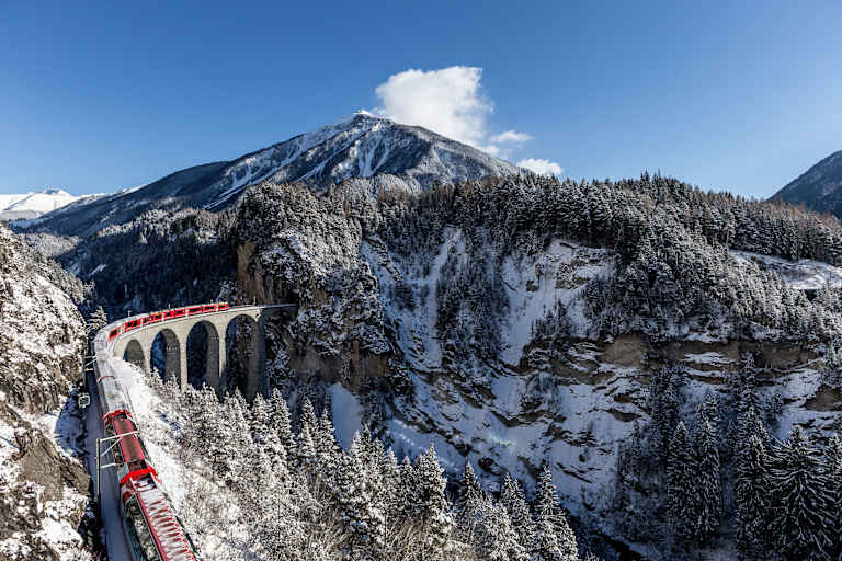 Wer an die Albulabahn in Graubünden denkt, dem kommt als erstes wohl das spektakuläre Landwasserviadukt in den Sinn. Die 65 Meter hohe und 136 Meter lange Steinbogenbrücke, die direkt in den Landwassertunnel führt, ist zum Wahrzeichen der Rhätischen Bahn geworden.