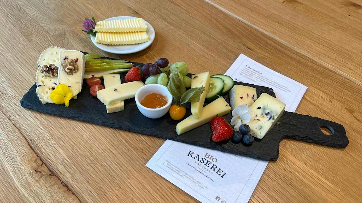 Die Biokäserei Walchsee liegt direkt an der B172 auf dem Weg von Kufstein nach Walchsee. Die dahinterstehende Genossenschaft wurde bereits 1904 gegründet, heute beliefern 60 Bauernfamilien aus der Region die biologische Käserei. 2019 wurde die Produktionsstätte umgebaut und ein Bistro eröffnet. Wir verkosten eine Käsevariation, die reichlich mit Obst und Nüssen garniert ist. Im direkt anschließenden Shop findet man weitere Bio-Produkte aus der Region, die sich gut als Urlaubs-Mitbringsel eignen.
