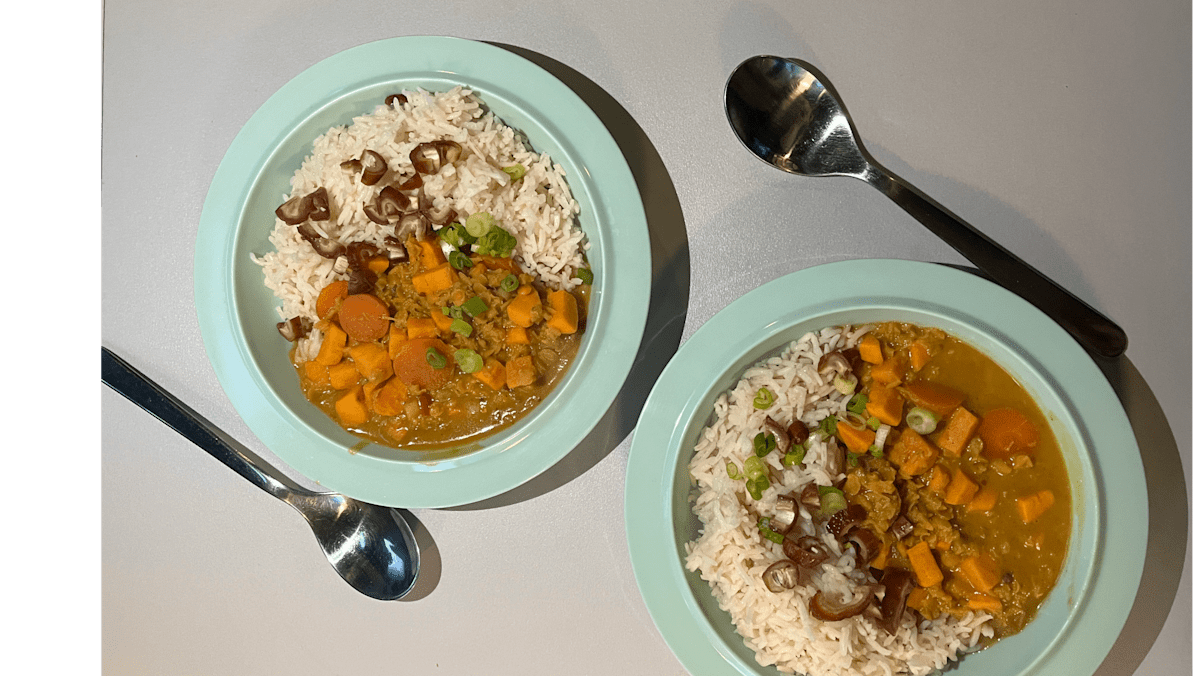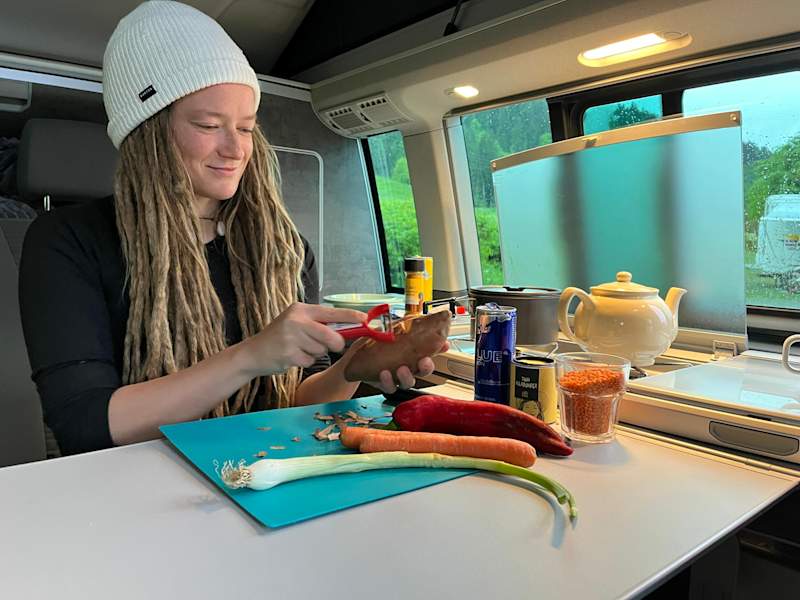 Mit Kühlschrank, Waschbecken und zwei Gasflammen ist die Surfer Suite von Roadsurfer bestens ausgestattet und so möchten wir uns auch mal selbst verköstigen. Wir finden: Unser veganes Curry aus Süßkartoffeln, Karotten und Linsen kann sich durchaus sehen lassen!
