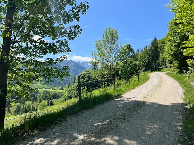Unsere zweite Mountainbike Tour soll dann doch weiter hinauf gehen. Wir starten am Westufer des Walchsees, dort haben wir unseren Van beim Parkplatz Seestraße abgestellt. Die ersten paar Meter führt uns ein Schotterweg über eine kleine Halbinsel. Hier, am Rand des Walchseer Hochmoores, haben wir abwechselnd den Walchsee und den Zahmen Kaiser vor uns. Vorbei am Terrassen-Camping Südsee geht es immer am seeseitigen Radweg entlang bis zur Hauptstraße. Dort biegen wir nach rechts ab, fahren vorbei am Hotel Seehof und biegen dann bei der Trachtenstube Achorner links ein. Ab jetzt folgen wir der Beschilderung zur Haraualm, unserem Ziel für heute Nachmittag.