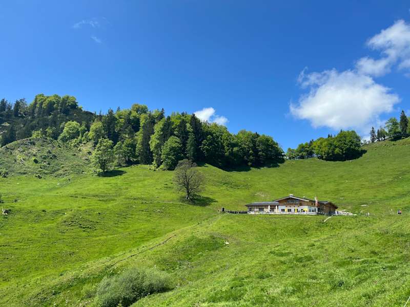 2019 wurde die Hütte neu errichtet, die Speisekarte ist aber gut wie eh und je: Wirtin Christine Mair bietet typische Almgerichte wie Brettljause und selbstgemachte Kaspressknödel an. Bei Schönwetter genießt man auf der großzügigen Terrasse nicht nur den Ausblick auf den Zahmen Kaiser, sondern sieht bis zu den Hohen Tauern. Mit etwas Glück erspäht man sogar die Spitze des höchsten Berges Österreichs. Währenddessen wird man selbst von den Kühen, die sich gleich nebenan im Stall befinden, durchs Fenster beobachtet.