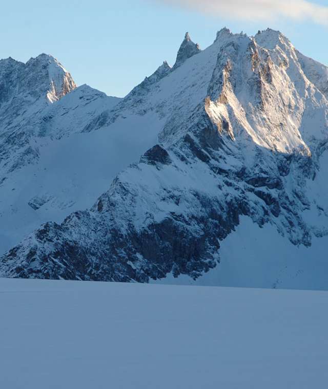 Etappe 4 zählt zu den schwierigsten Abschnitten der Haute Route: Anspruchsvoll geht es zum Plateau du Couloir (3.650 m), dessen 45° steile Flanke mit Steigeisen und Pickel überwunden wird. Nach einer Querung zum Col du Sonadon (3.504 m) bietet sich mit dem Grande Tête de By (3.586 m) eine Gipfelmöglichkeit mit atemberaubender Rundumsicht.