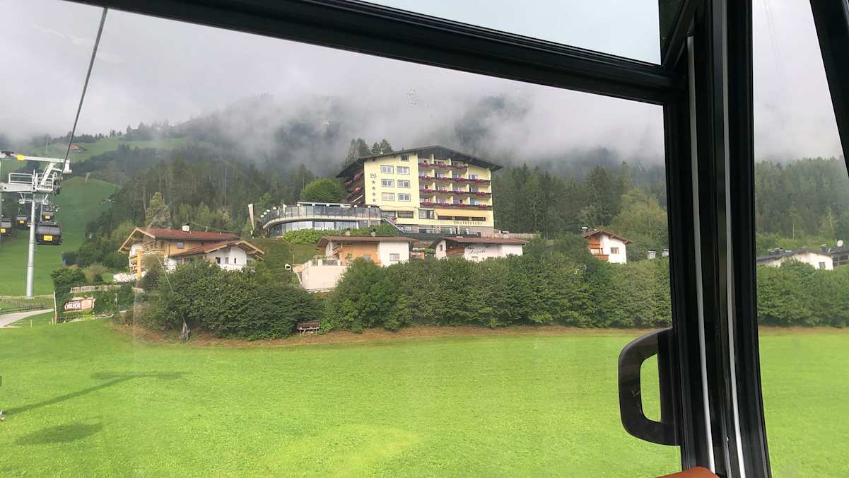 Gut erholt ging es am zweiten Tag mit der Spieljoch-Bergbahn hoch hinauf zur Bergstation auf 1.860 Meter. Während der Fahrt hatten wir einen wundervollen Blick auf Fügen und ins Zillertal. Oben angekommen, wurden wir den ganzen Tag von Wolken begleitet, aus denen konstant leichter Nieselregen fiel. Von der Bergstation aus starteten wir unsere Wanderung nach Hochfügen. Von Feuer & Eis Touristik erhielten wir ausführliche Wegbeschreibungen in gedruckter Form und als Komoot-Tour, mit deren Hilfe wir selbstständig und in unserem eigenen Tempo wandern und uns orientieren konnten.
