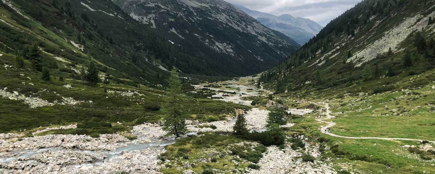 Der letzte Tag unserer Wanderung beginnt mit dem Bustransfer zum Schlegeisspeicher. Eine Stunde lang geht es mit dem Bus über Serpentinen hinauf, bis auf 1.780 Meter. Hier genießen wir den weiten Blick auf den See und die dahinter liegenden Gletscher, bevor wir dann auf einem leicht ansteigenden Weg aus Steinplatten entlang eines malerischen Baches durch die wilde Ebene des Hochtales wanderten. Der Weg führt uns über die Lavitzalm (2.095 Meter), die eine kleine Hütte als Bergbauernmuseum hergerichtet hat, hinauf zum Pfitscherjoch. Hier überschreiten wir die Grenze zwischen Österreich und Italien und damit auch den Alpenhauptkamm. Unterhalb des Pfitscherjochhauses (2.275 Meter) sind noch Befestigungsanlagen aus dem Zweiten Weltkrieg zu sehen, bevor uns der Pfad Nummer 3 steil bergab ins Tal führt.