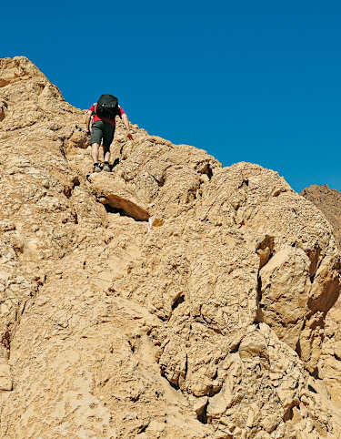 Anstrengende Wanderung in der Negev-Wüste: Am südlichen Rand des gewaltigen Ramon-Kraters fällt ein dunkel gefärbtes Bergmassiv ins Auge, dessen höchste Erhebung das Ziel dieser Tour ist: Shen Ramon (693 m), der „schwarze Berg“ Israels. Über seinen Gipfel sowie über zwei weitere Berge führt diese anspruchsvolle Wüstenwanderung, die nicht nur landschaftlich reizvoll ist, sondern auch aufschlussreiche Einblicke in die Kratergeologie gewährt.