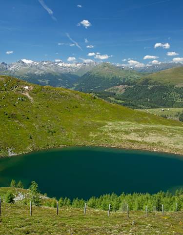 Eingebettet in die sanften Formen der Nockberge befindet sich der Laußnitzsee ziemlich genau auf 2.000 Metern Höhe. Eine leichte Wanderung von rund zwei Stunden führt von der Neuen Bonner Hütte direkt zum See, der trotz seine Höhenlage im Sommer beachtlich warm wird.