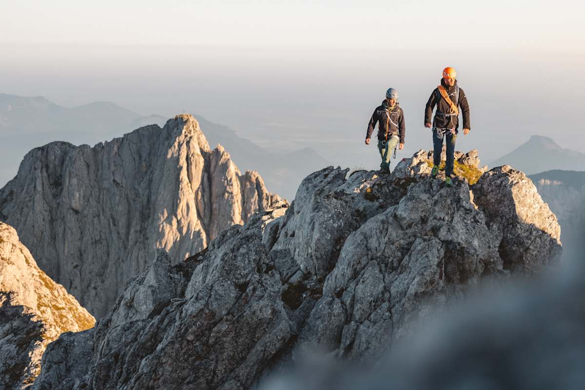 Der Wilde Kaiser zählt zu den bekanntesten Alpinklettergebieten der Alpen. Kletterpioniere wie Paul Preuss, Herman Buhl und Hans Dülfer haben hier Geschichte geschrieben. Heute bietet das Bergmassiv Routen für alle Könnerstufen – vom klassischen Genussgrat bis zur anspruchsvollen Mehrseillänge. Ein echter Klassiker ist der beliebte Kopftörlgrat (III) auf die Ellmauer Halt. Von der Wochenbrunner Alm führt eine lange und luftige Gratkletterei über unzählige Felstürme auf den höchsten Gipfel des Kaisergebirges. Ebenfalls lohnend: der Führerweg (III) auf das Totenkirchl mit feinem Fels und eindrucksvoller Kulisse. Wer sportlich unterwegs ist, findet in der gut abgesicherten Wirtskante (VI+) an der Vorderen Karlspitze eine spannende Tour über steile Platten und Pfeiler. Ideal für heiße Sommertage ist der König der Löwen (V+) am Treffauer Nordwandsockel. Die Zutaten für die beliebteste Route im Schneekar sind einfach: Gute Absicherung trifft auf schöne Wasserrillen und Platten. Die Route Blue Moon (VI+) auf die Kopfkraxn gehört zu einer der schönsten Piaz-Verschneidungen der Ostalpen. Eine gut, aber nicht übertrieben abgesicherte Mehrseillänge mit alpinem Charakter.