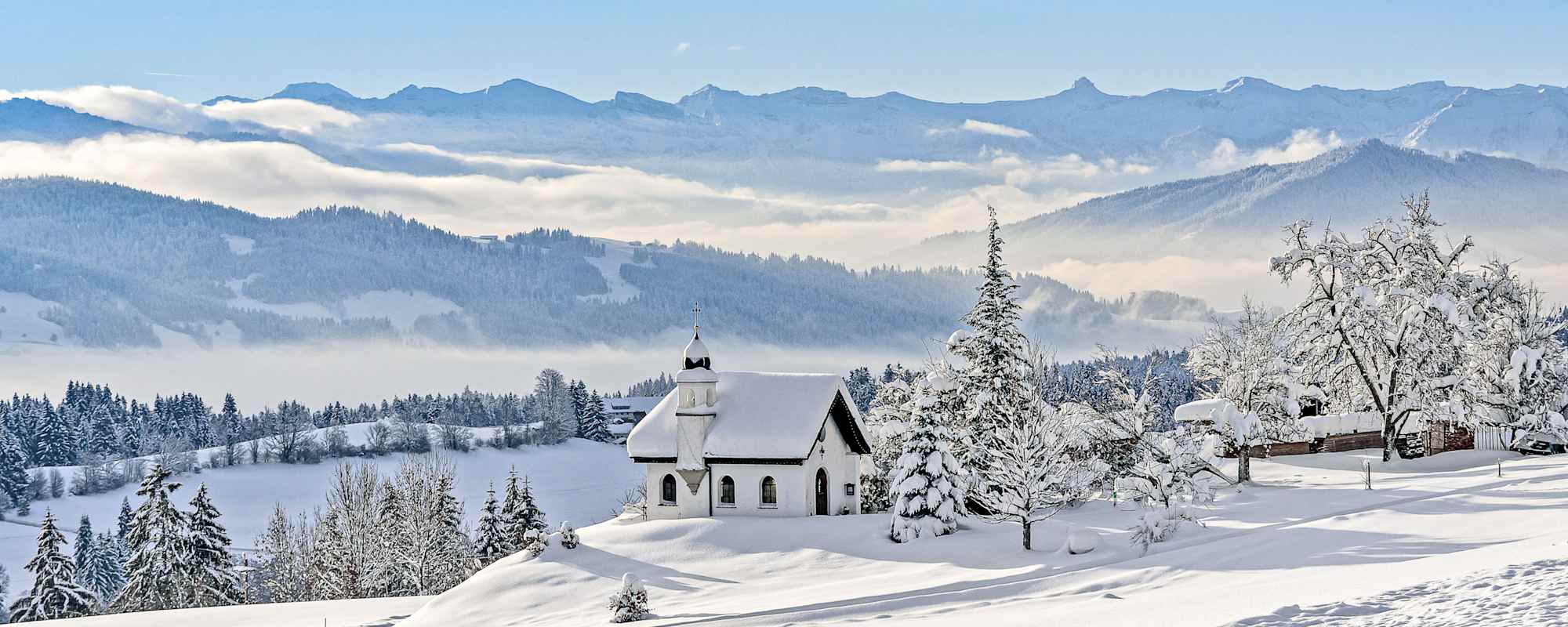 Die Luft ist klar und frisch. Es herrscht angenehme Ruhe, nur das Knirschen des Schnees unter den Füßen ist zu hören. Auf den über 30 Kilometern präparierten Winterwanderwegen lässt sich die Landschaft rund um Scheidegg entspannt entdecken. Ein Highlight ist der knapp elf Kilometer lange Höhenweg von Scheidegg zur Pfänderspitze. Die mittelschwere Winterwanderung verspricht oft strahlenden Sonnenschein, selbst wenn unten im Tal der Nebel hängt. Unterwegs laden einige Kapellen zum Besuch ein und sind, wie die Anna- oder die Ulrichskapelle, zwischen 500 und 1000 Jahre alt. Auf dem Bregenzer Hausberg bietet sich eine herrliche Aussicht auf den Bodensee und das Dreiländereck. Wer mit der Pfänderbahn vom Gipfel ins Tal gleitet, gelangt ganz bequem von Bregenz mit dem Bus zurück nach Scheidegg. Schöne Alternativen sind die Winterwanderung durch den landschaftlichen Kurpark oder rund um Scheffau.