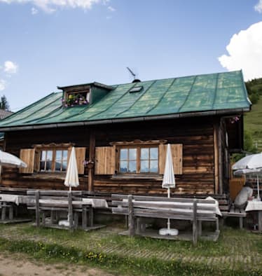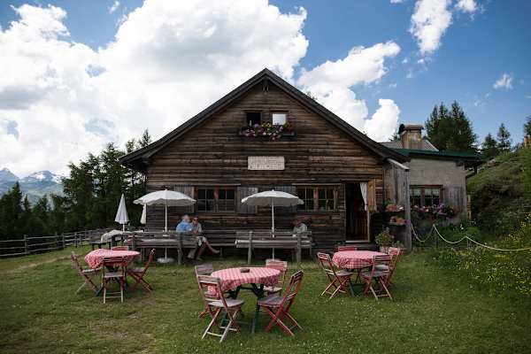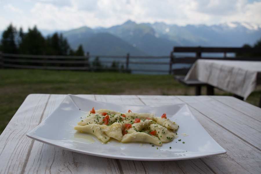 Eine Runde älterer Damen verlässt die Hütte gerade wieder – schick sind sie unterwegs, sogar im Dirndl! Am Vorplatz, der wegen den Kühen eingezäunt ist, wird gerade geheut. Es duftet herrlich und die roten Tischtücher, die um die runden Tischchen vor der Hütte gebunden sind, lassen mich glauben wir seien im Märchenbuch gelandet. Wir freuen uns auch auf den Schatten und noch viel mehr auf das Essen, denn die Hütte auf 1.868 Metern wirbt damit das höchstgelegene Bio-Restaurant Europas zu sein.