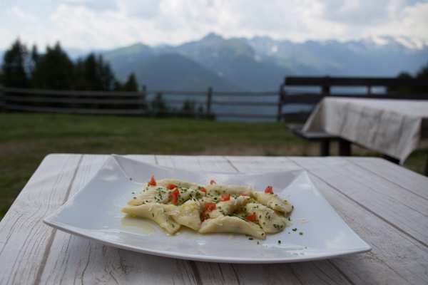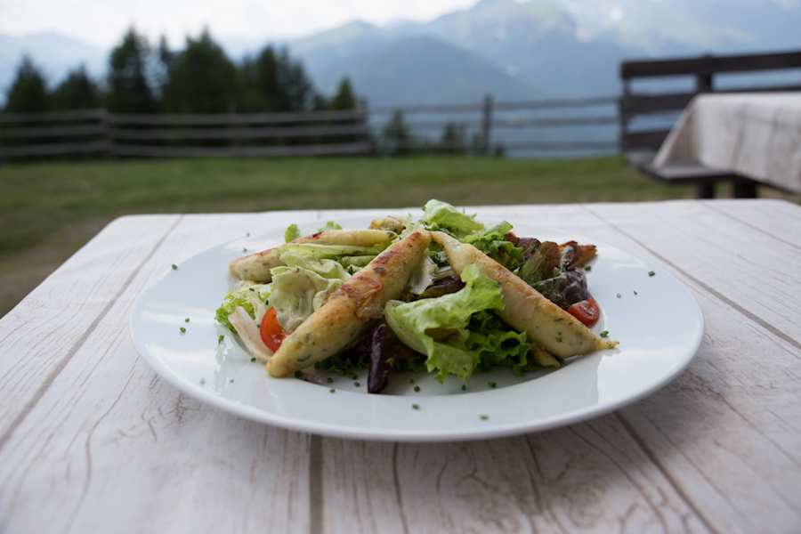 Wegen der Hitze lasse ich die Wildkräutersuppe – schweren Herzens – aus und wähle die gebratenen Erdäpfelnudeln im Speckmantel auf Frühlingssalat. Die Weinkarte ist auch nicht zu verachten. Diese Südtiroler… wunderschöne Berge und so gutes Essen, dass man nach dem Mahl gleich wieder wo rauf muss um die Kalorien zu verbrennen.