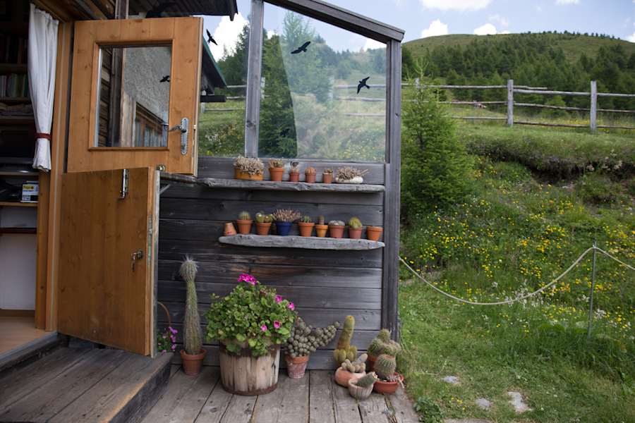 Die Speisekarte ist nicht lang, dafür fällt die Entscheidung umso schwerer denn jedes einzelne Gericht spricht mich an. Kochen ist Brigittes Leidenschaft und so ist jedes Gericht eine liebevolle Zusammenstellung regionaler Produkte, frischer Kräuter und Gewürze. Ähnlich liebevoll arrangiert sind die kleinen Kakteen, die die Seitenwand der Hütte zieren und sich der kräftigen Bergsonne erfreuen.