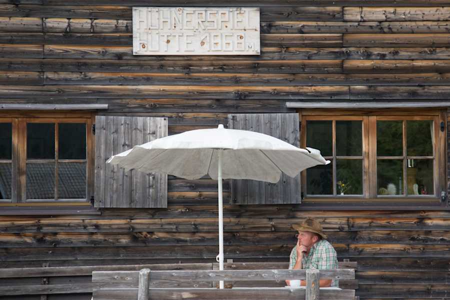 Mit vollem Magen rasten wir noch eine Weile im Schatten, blicken über die Wipptaler Bergwelt und unterhalten uns mit Klaus über Gott und die Welt. Oder genauer gesagt: über die Amerikaner, die hier früher einmal einen Lift zu ihrer Militärstation gebaut haben, die Griechen, die in den Medien gerade mit ihren Finanzproblemen Furore machen, die Hütte und ihre Geschichte an diesem besonderen Ort. Es ist ein guter Ort um zu rasten, ein bisschen zu philosophieren, nachzudenken oder die Gedanken auch einfach mal loszulassen.