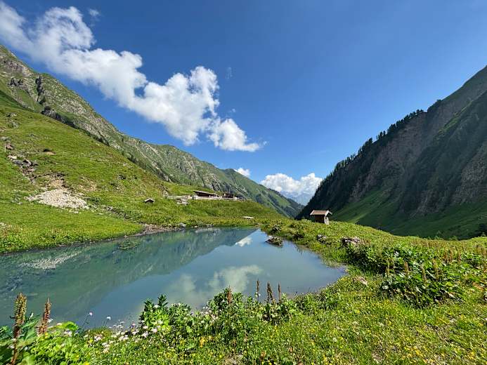 Die Baumgartalm mit kleinem Teich Foto: Martina Meusburger Bildergalerie (11) Karte ansehen