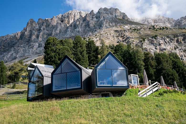 Der ästhetische Holzbau der Berghütte Oberholz schmiegt sich an das Gelände. Die drei Satteldächer wachsen wie Verästelungen aus dem Hang heraus, als würde ein Baum den Berg hinunterfallen. Drei Stuben mit großen Fensterfronten und eine Aussichtsterrasse, die über dem Abhang schwebt: die umliegende Bergwelt steht absolut im Mittelpunkt der Konstruktion. Die Aussicht reicht bis in die Lagorai- und Brentagruppe, in die Berge der Texelgruppe, in das Ortler-Massiv, die Ötztaler und Stubaier Alpen.