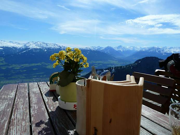 Weiters: Pfeis-Hütte (1.922 m, 4 h); Halleranger Alm (1.768 m, über Lafatscherjoch; 2:30 h); Thaurer Alm (1.461 m, über Törl durch Halltal; 4:30 h); Solstein-Haus (1.805 m, über Möslalm und Pfeishütte; 8 h)