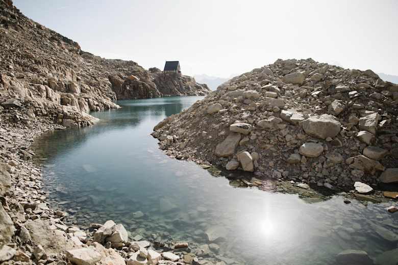 Die relativ neue Hütte (1975 errichtet, 1985 um einen Zubau erweitert) mit insgesamt 86 Betten sitzt prächtig auf einem Felssockel über einem kleinen See, der aus einem Gletscher gespeist wird.